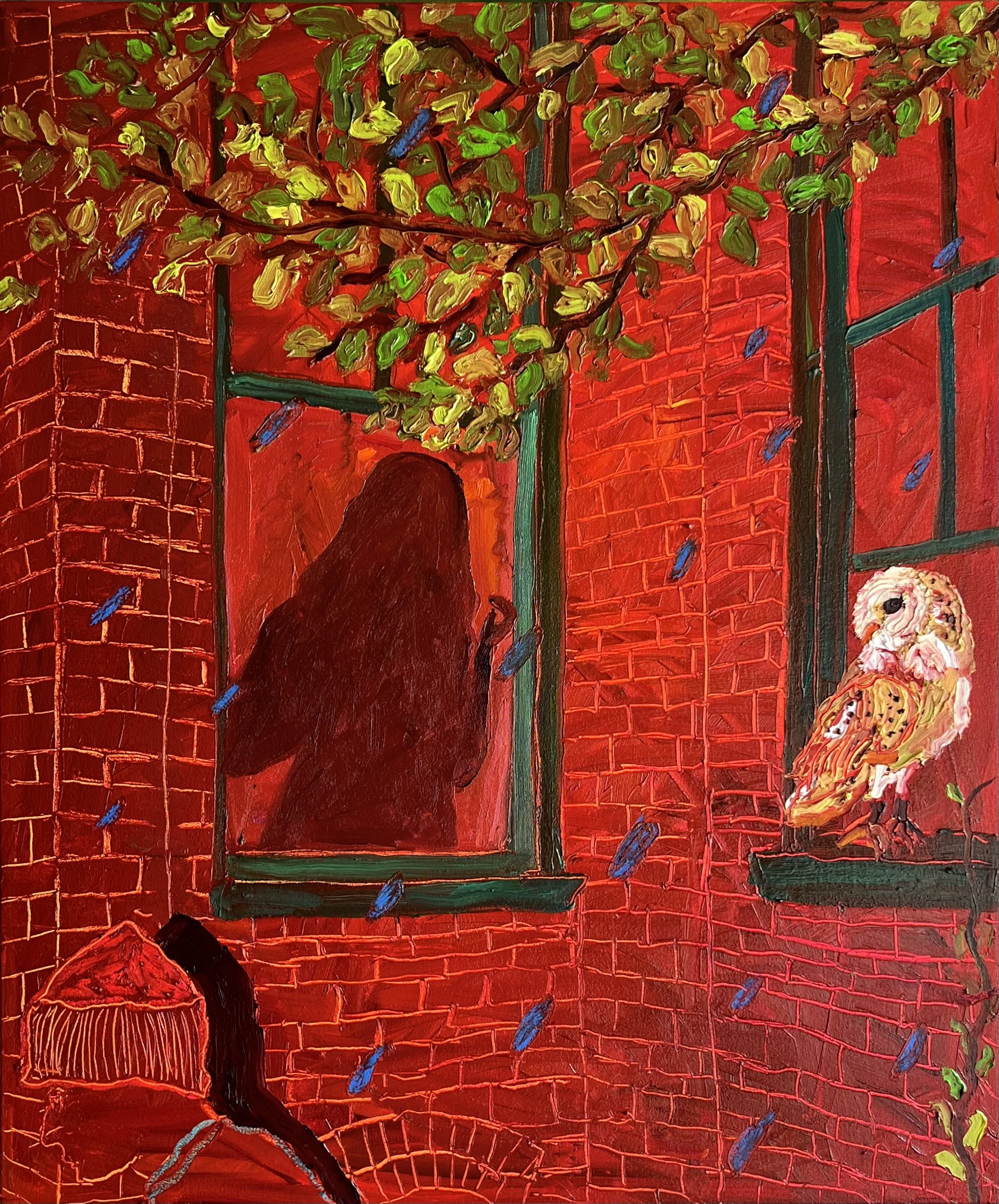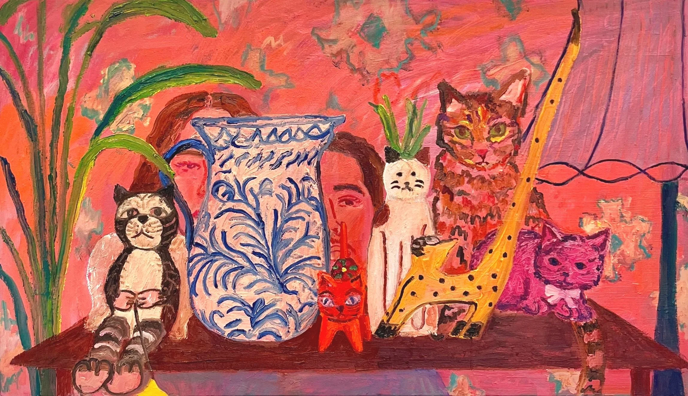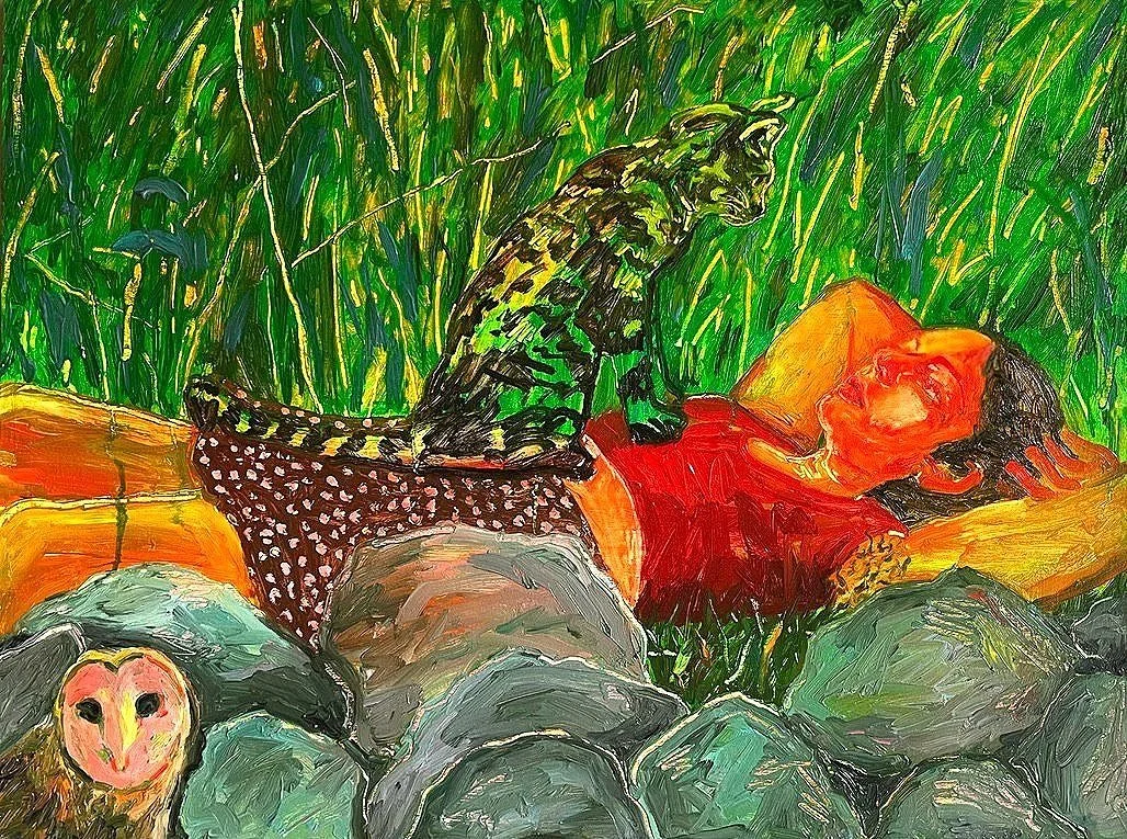 Magic Cat and Pink Owl, oil on canvas